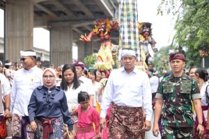 Dalam pawai ogoh ogoh ini, Wali Kota Bekasi bersama Dandim 0507 Bekasi bersama Ketua TP PKK Kota Bekasi, Wiwiek Hargono ikuti pawai tersebut bersama para umat hindu yang ada di Kota Bekasi dalam perayaan hari nyepi tahun 2025. (Abu Hasan Safii Joko)