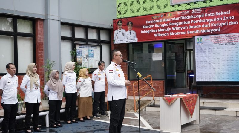 Kota Bekasi, zonainformasinew.com – Dinas Kependudukan dan Pencatatan Sipil Kota Bekasi melaksanakan Deklarasi dalam rangka penguatan pembangunan Zona Integritas menuju Wilayah Bebas dari Korupsi ( WBK ) dan Wilayah Birokrasi Bersih Melayani ( WBBM )